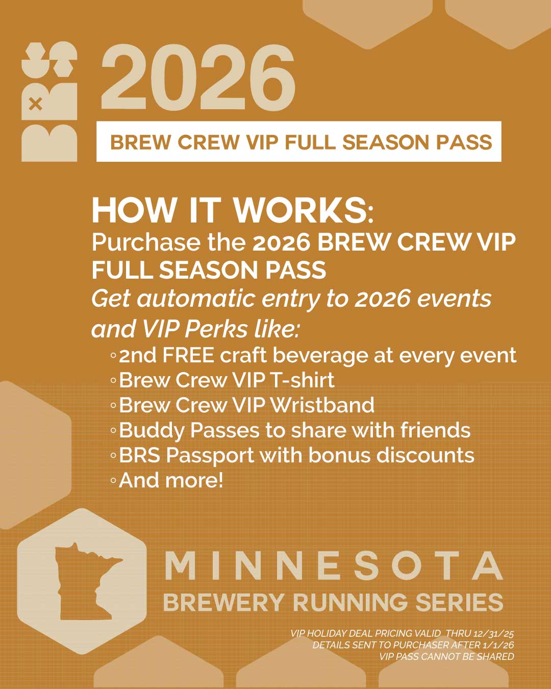 Sign up now as a 2026 Brew Crew VIP (two package options below) and get the best access and perks Minnesota Brewery Running Series has to offer.
